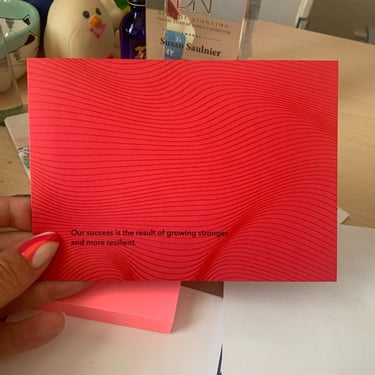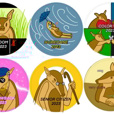 a lanyard in Viva Magenta with the matching organic wave design on the tickets and announcements, both if which are shown to the left, a color-temperature-changing cup with Remy the Armadillo (the school's mascot) in his cap and gown, a small postcard illustration with a contents list of what everything was and who it was from, departmentally, a class pin, and sticker sheets of Remy representing all graduating majors.