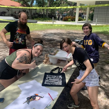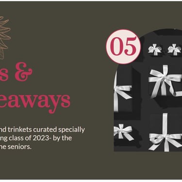 The commencement gift team worked to have gifts and giveaways loaded in a Ringling College tote bag to accompany the cap-and-gown pick-ups. We used up the college's inventory of tote bags and offered a screen printing day to customize the bags to 2023. Inside of the bags were: