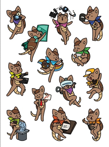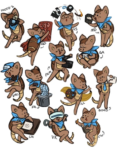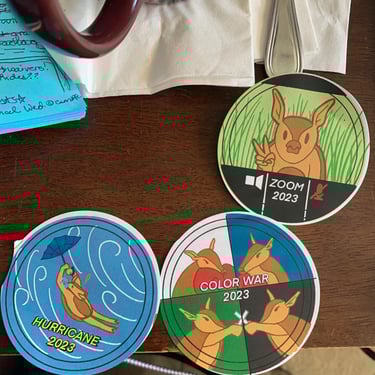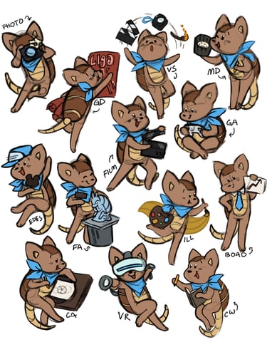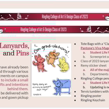 Lanyard design by Alisen Grant, class pin designs were provided by the Alumni office, 'contents' postcard illustration and Remy sticker illustrations by Sparky Sparks, vectorized Remy and 'contents' postcard design by Reilly Phillips, announcement and tickets designed by Ringling College Design Center.