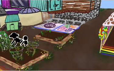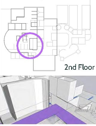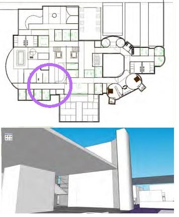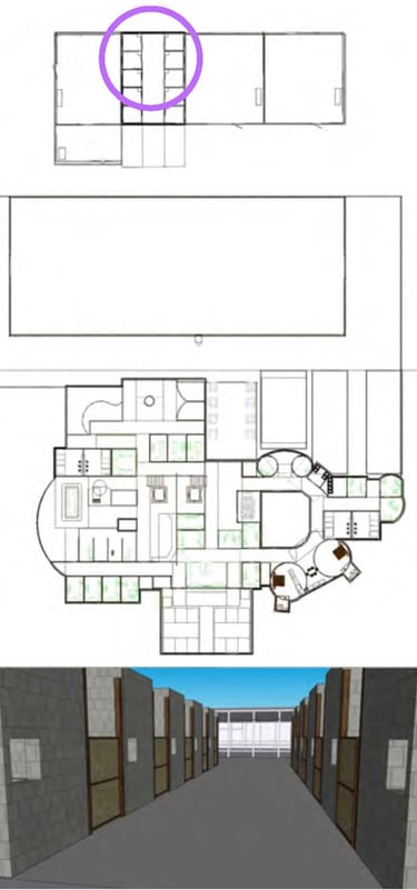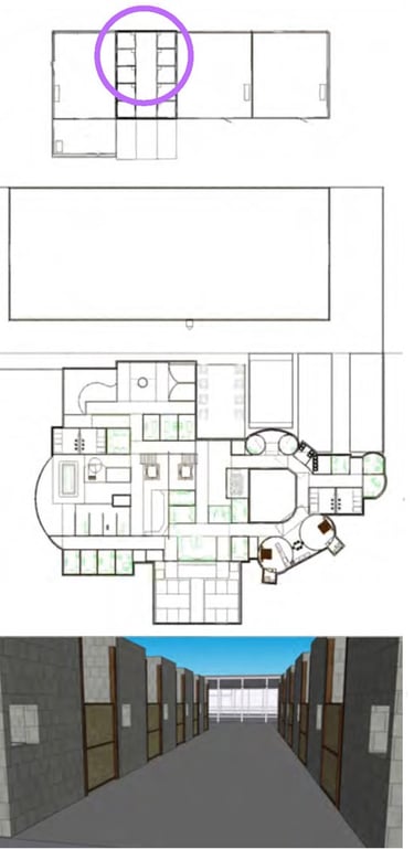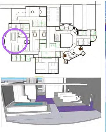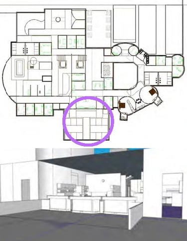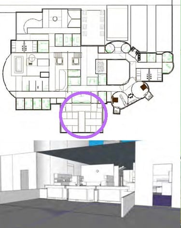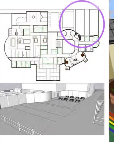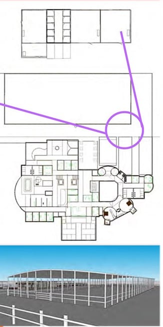 My design has an overall footprint of about 80,000 square feet (79,539.63). Approximately 11,000 square feet across two levels to create the physical therapy rainforest, 8,500 square feet to blast into outer space with Kepler - 186f, 11,000 square feet with two floors for staff, 14,000 square feet dedicated to horse stables with a 16,000 square foot riding arena, 1,000 square foot area dedicated to meditation maze(s), 3,200 square feet space for gardening, and a 1,400 back deck seating area for all to enjoy.