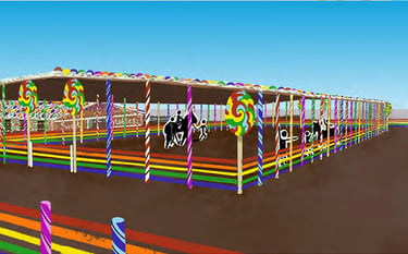 Outside of Appointment Play’s main building is Sweet Stables, a sweet retheming for hippotherapy. Adventurers become equestrians as they travel through gingerbread and larger-than-life sweets.