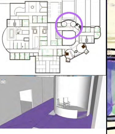 Also seen here are the sensory-controlled caves. Filled with soft seating, each space is soundproofed and equipped with adjustable lights and control over sounds and volume.