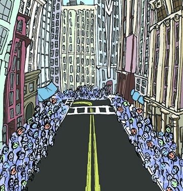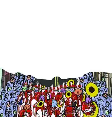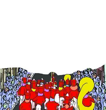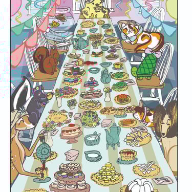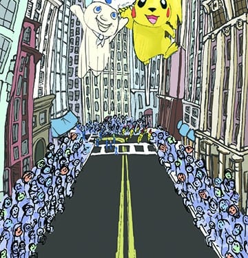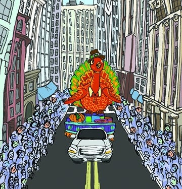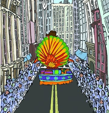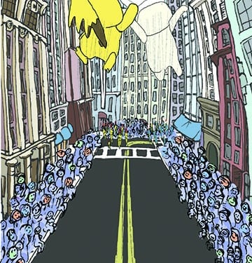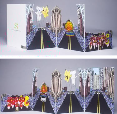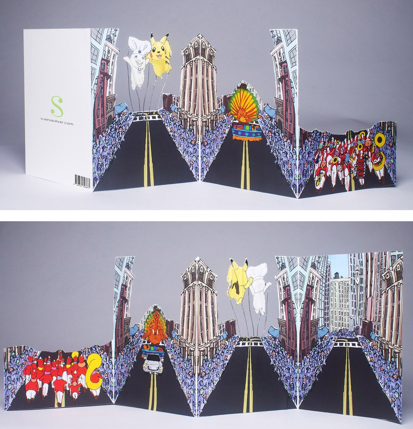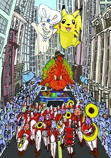 This is my Thanksgiving Card prototype. My favorite part of Thanksgiving has always been the magic surrounding the parade, with giant balloons, complex floats, large bands playing familiar songs, and so many people packed along the street, wanting to be at that epicenter of celebration. I have yet to go, which is probably why I wanted to make this condensed, collapsible version. Everything was first drawn in my sketchbook and then scanned in and colorized in AdobePhotoshop.