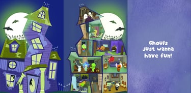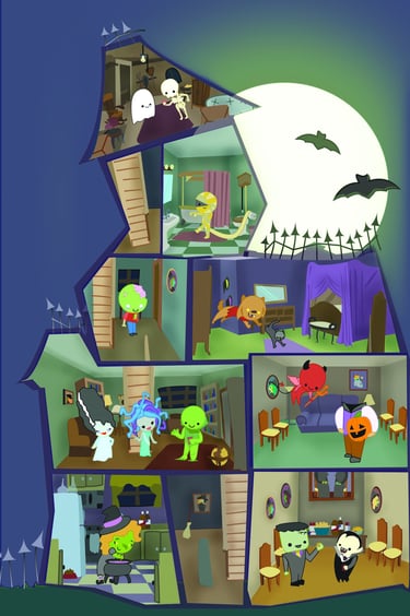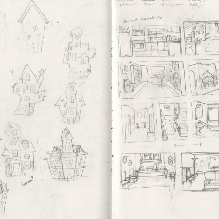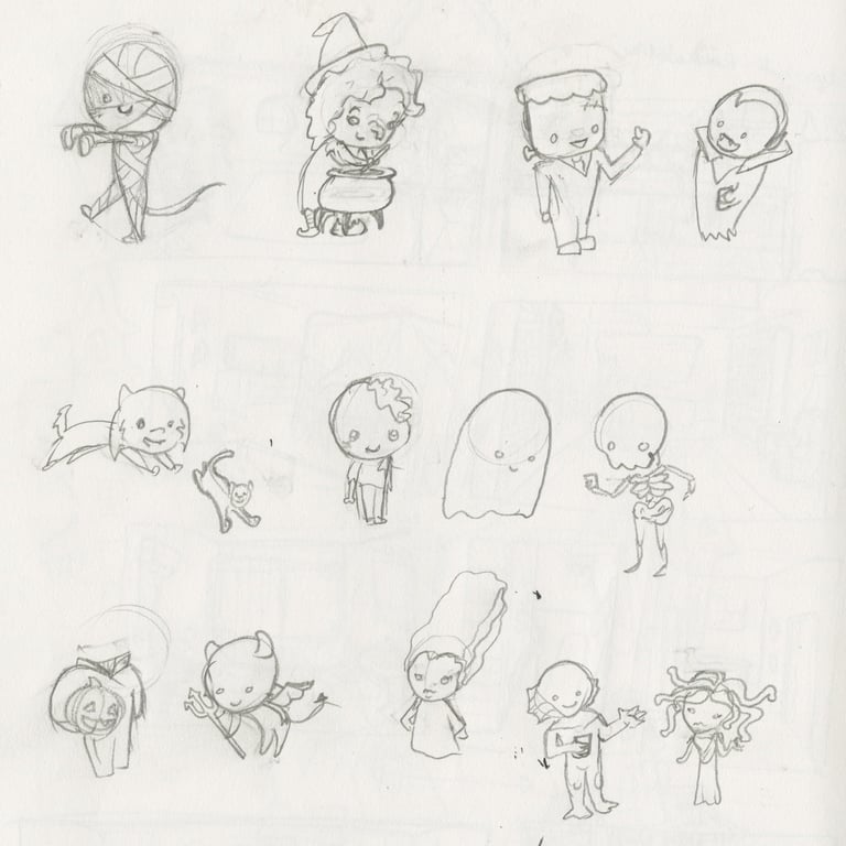 Above left are all of the characters attending the witch's party. Above center and right are my sketchbook showing the ideas for the house, the rooms, and the guests attending the witch's party.