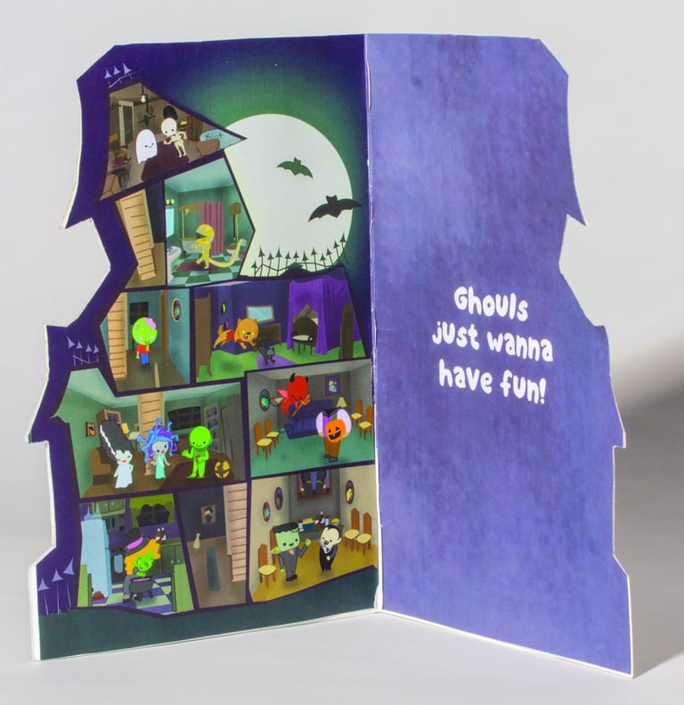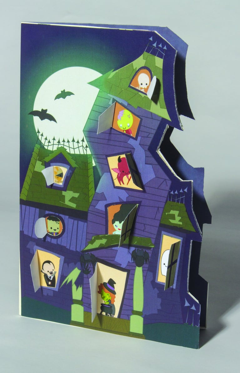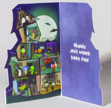 I have always enjoyed section views of buildings. I loved getting lost in the rooms and all of the little clutter in all of the spaces, and the more the world is filled, the better. I also love interactive art and the whimsy that comes with childhood flip books, and decided to make the card that I had always wanted to see.
