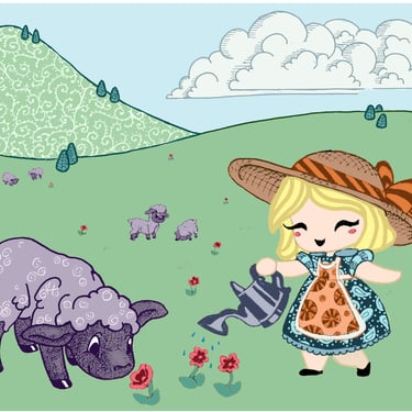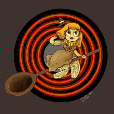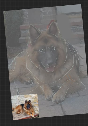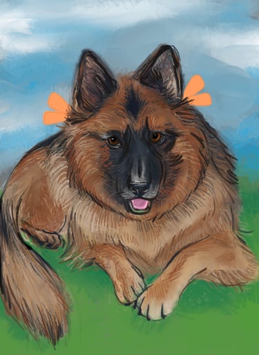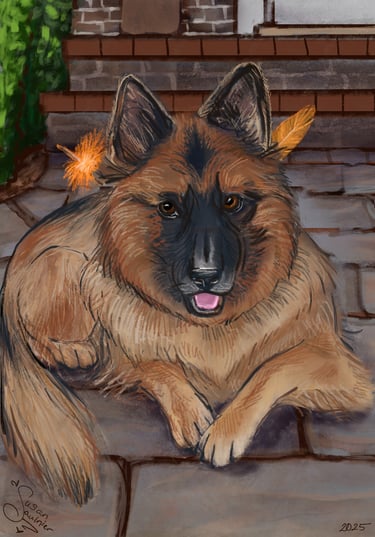 Above is the progression of my work. I started by photo-bashing pictures of Ana to get a general shape and feeling before going in with color. I treat my digital paintings like my traditional paintings, often working on one layer and maybe putting elements (ie, the feathers) or particularly challenging parts (the mouth and her ears tripped me up) on a separate layer to focus on. I used a placeholder field background until I received the direction for the front porch. I was also told that she looked a little too large on her right side (indicated by the yellow lines). I trimmed down the fur and placed her smiling at home. I used ProCreate for the project.