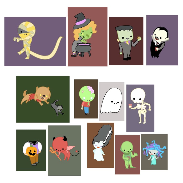 Short mention of my brain and creation style; I drew and scanned from my sketchbook the elements to be colored. I combined and colored ALL of the illustrations, then went to erase before printing. After the first, I asked why I was spending the extra time erasing and printing; I should have continued and put the additional elements in the space - hindsight.