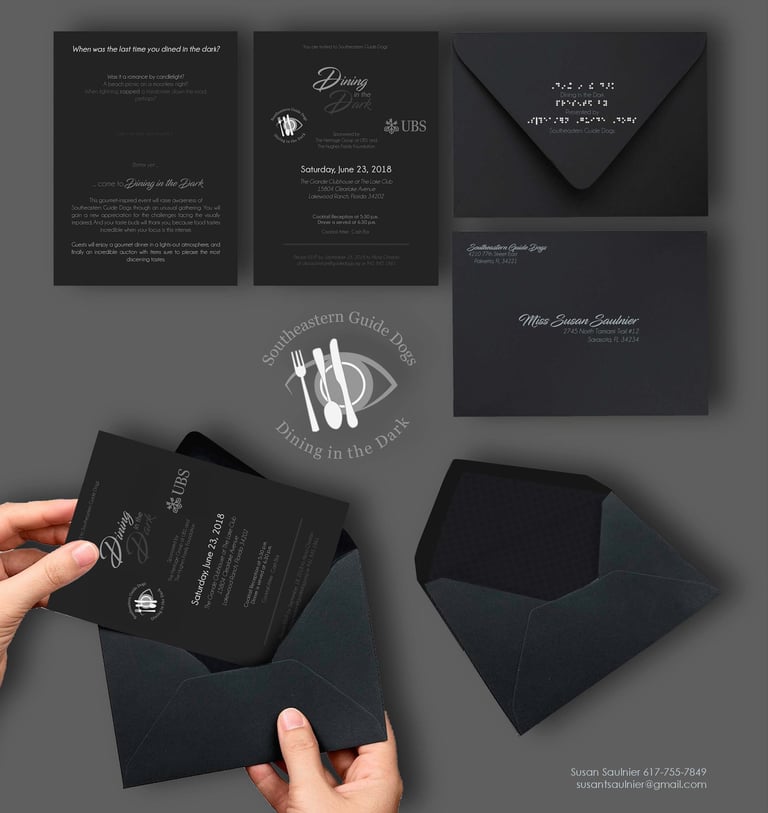 As part of an art test for the Southeastern Guide Dogs, I was challenged to blue sky pitch logos and invitations to their fundraising dinner, 'Dining in the Dark.'