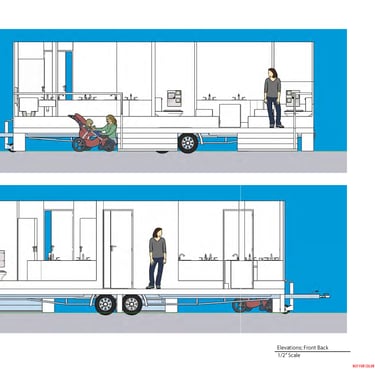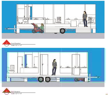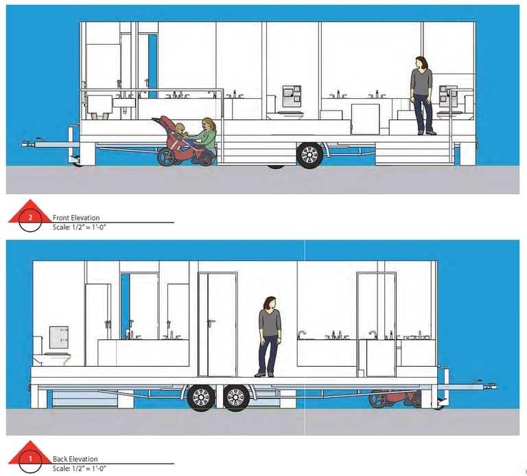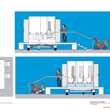 Turn-arounds and top-down view of portable restroom.