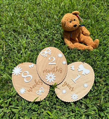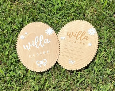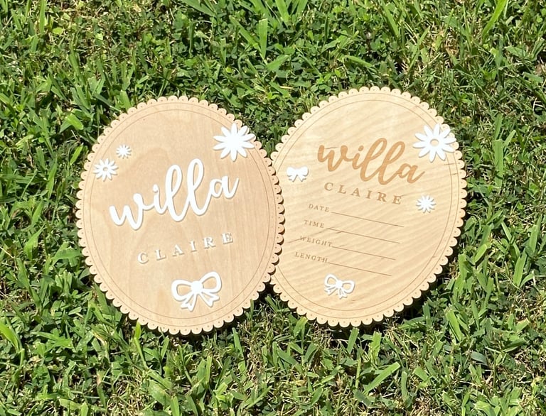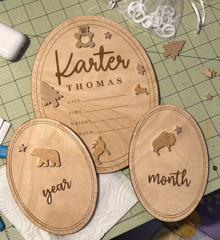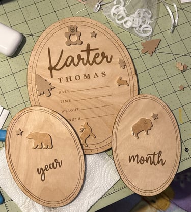 As my friends and family have started to grow their families, I have had the honor of creating arrival announcements and time plaques. I do not attach any of the acrylic elements or numbers, but will attach names upon request. I ask for any nursery or baby shower theme for the acrylic pieces so that it matches other purchased and existing decorations. Evertyhing is designed in AdobeIllustrator and cut on my GlowForge Laser Cutter.