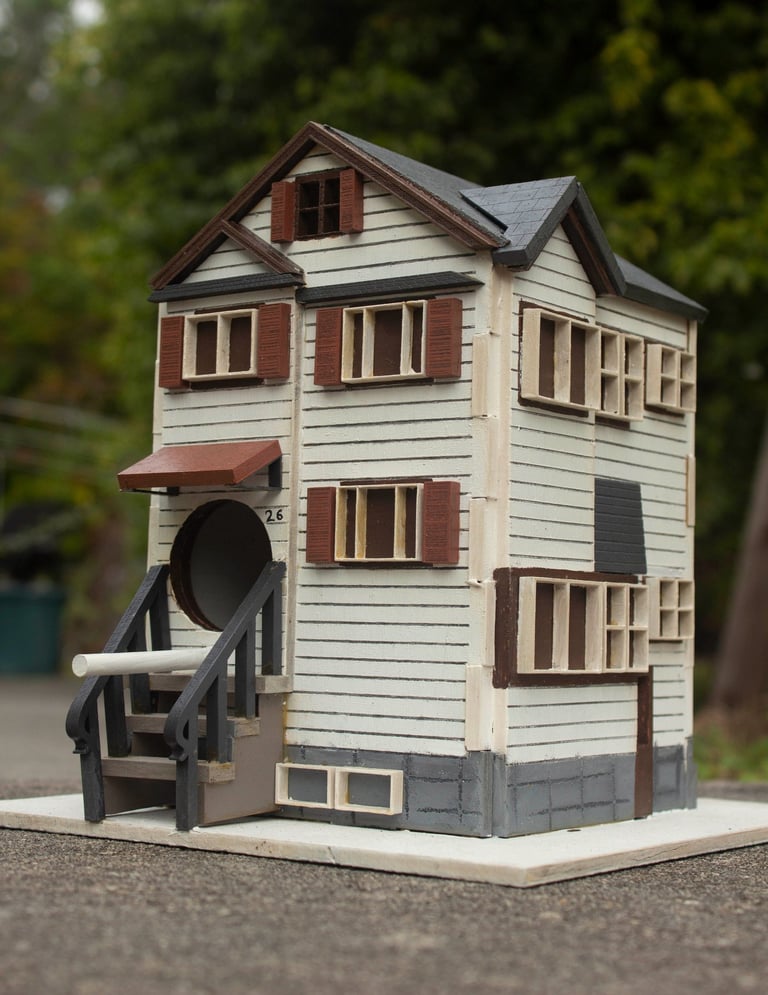Left is the birdhouse of my childhood home and my first laser cutting project. The design was mapped and outlined in Adobe Illustrator, and an SVG file was uploaded to the GlowForge app, to the laser cutter. Once cut, I painted and glued everything together.