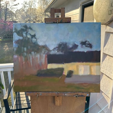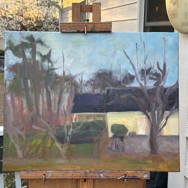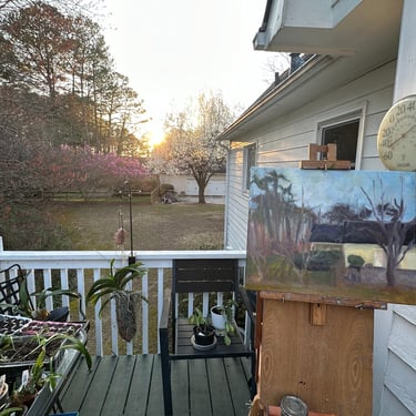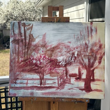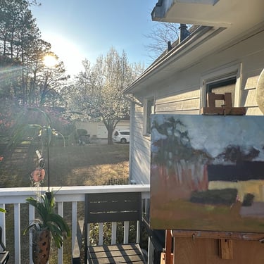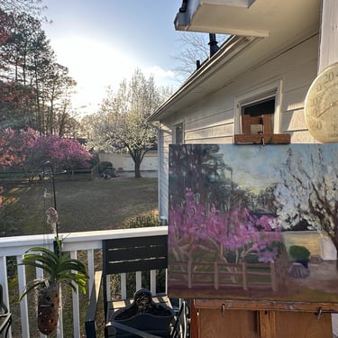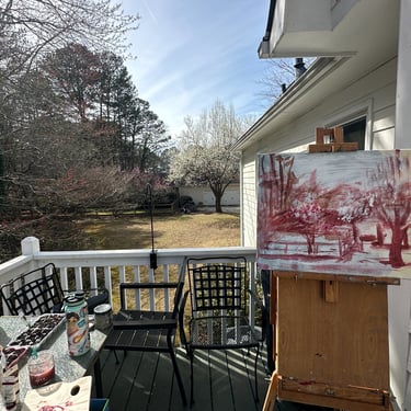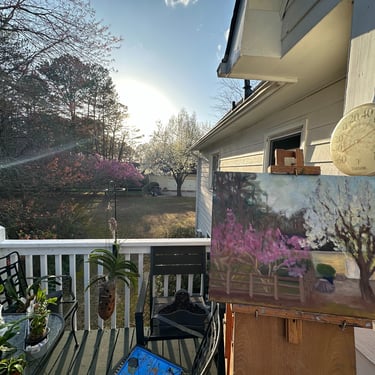 John and I are both artists and love watching artists on YouTube. One of our favorites is James Gurney. Every time we watch him paint, John and I look at each other and say, 'Let's do some plein air painting,' but we never do. As winter was ending, the trees surrounding my mom's house were in full bloom, and I just felt that I had to paint them. I set up my easel and dusted off my oil paints and did just that. I also took lots of photos to return to that moment during the bloom and that time of day to go back and work more on it, but as of right now (6/17/2025) that's where it currently stands.