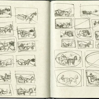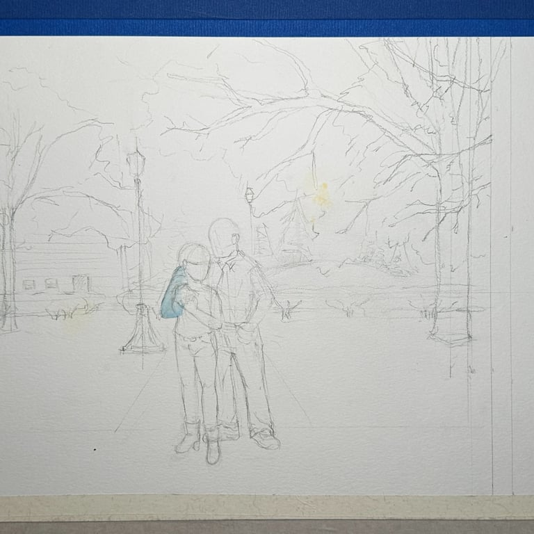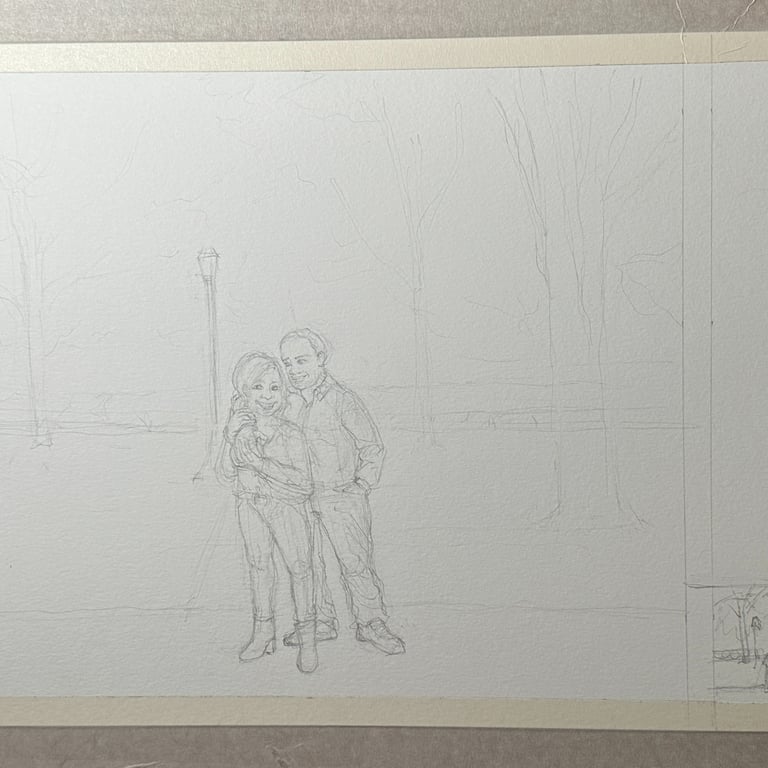 I sent the two thumbnails to the commissioner asking if they would like a fish eye look with a focus on the space as well as them, or the straight on view with the landmarks slightly condensed to fit. The latter was preferred with the idea that their clasped hands would be in the center, highlighted by the spiral of the iron fencing.