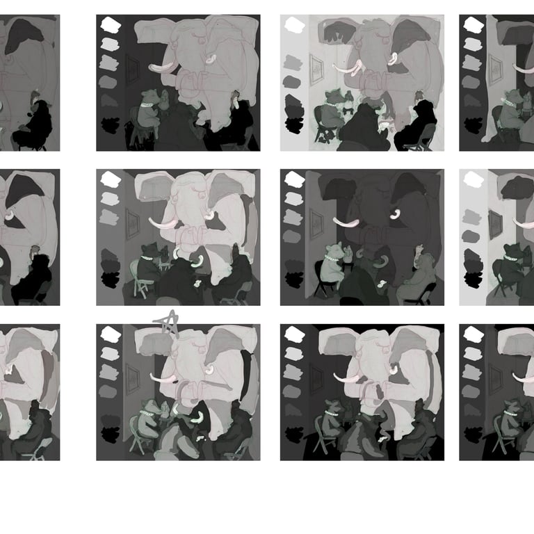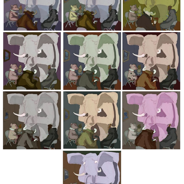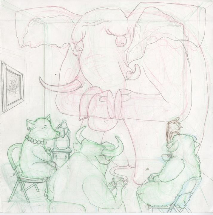 I love puns and word play and brought that love to life in this piece. Starting with the elephant in the room and working clockwise are: