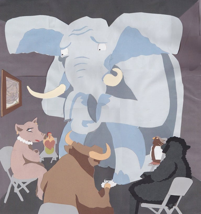 the aforementioned elephant, the wise owl leading the session, followed by a black sheep, a bull with his china teacup and saucer, pearls before swine AND makeup on a pig, ending with the egg vs chicken debate. The entire piece is cut paper and the eyes moved with the aid of a pull tab.
