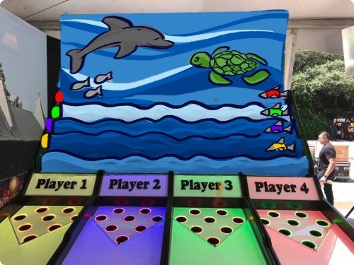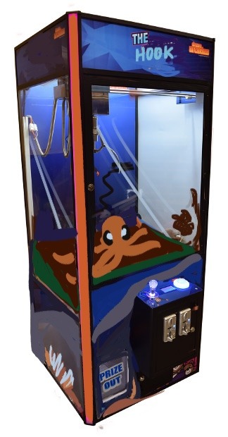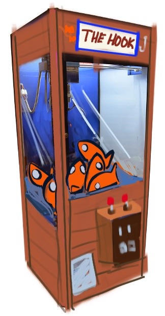 Claw-grabber prize game; The top-left is themed to and represents ocean quality in 1920s and the top-right is a modern hook game and represents ocean quality of 2020s.