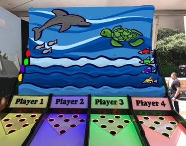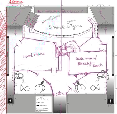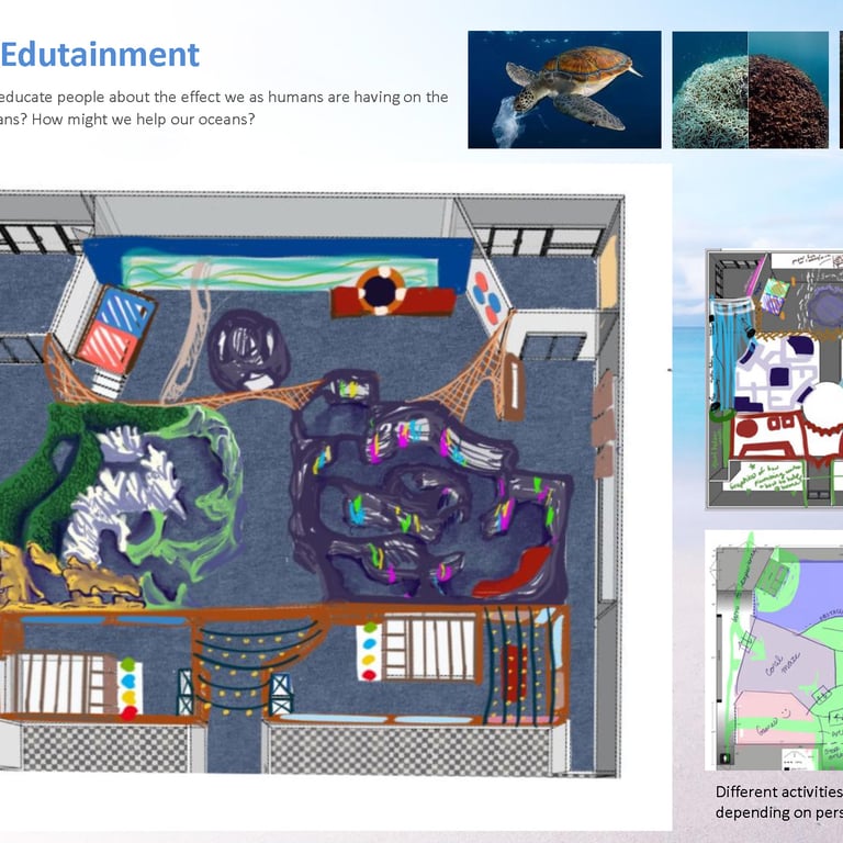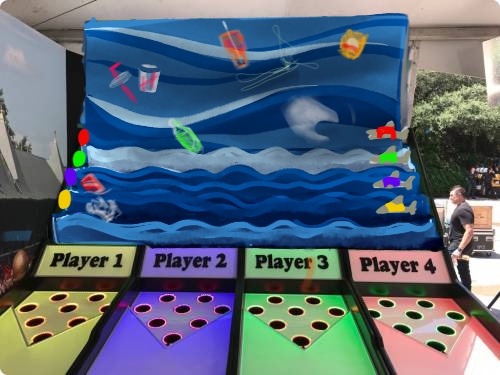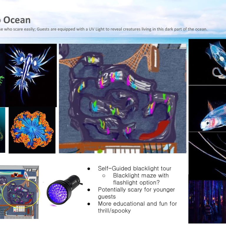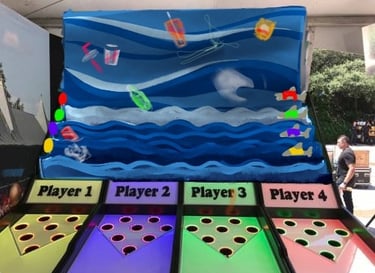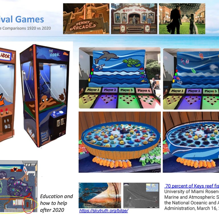 The largest space would be a comparison of ocean quality of 1920s vs. 2020s, highlighting the effects we as humans are having on the oceans, through carnival games.