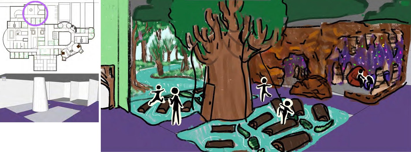 Near the window is a couch with a small water feature for guardians to sit and watch the adventure with blue and white ribbons hanging from the second level, emulating sitting under a waterfall.