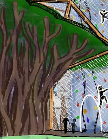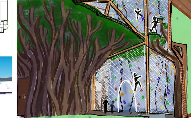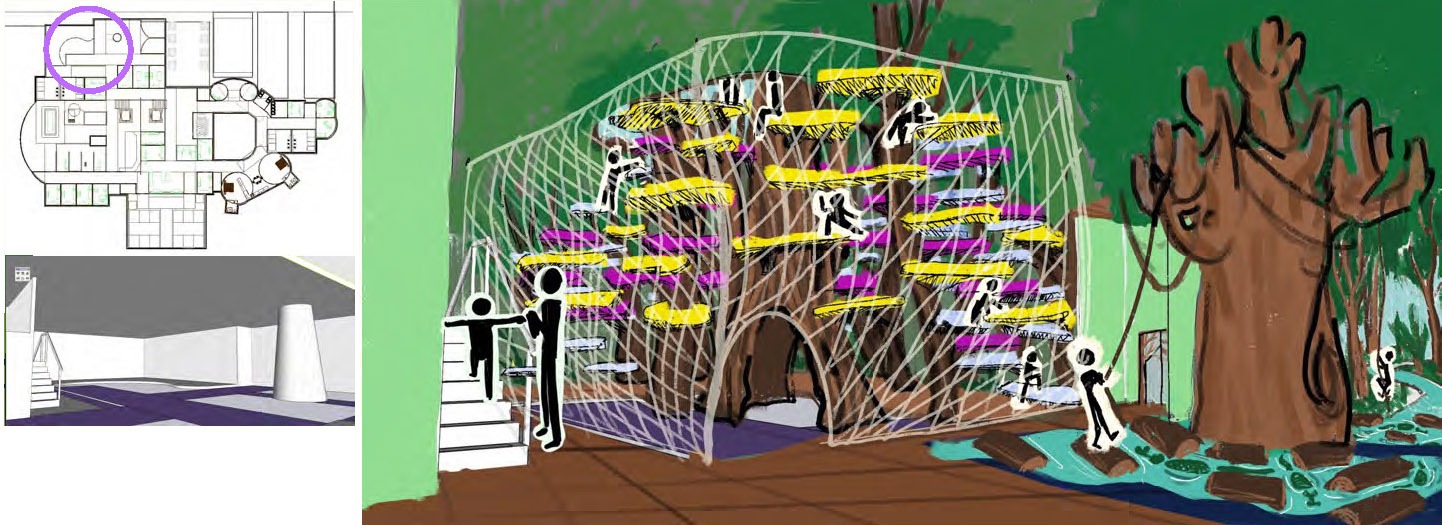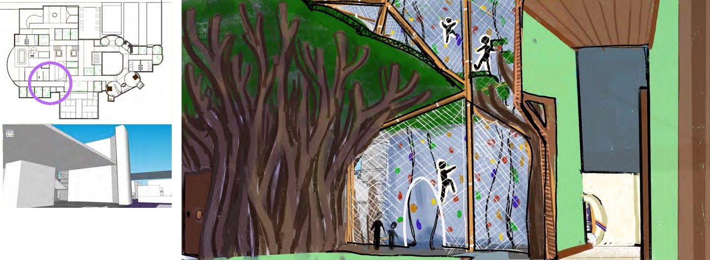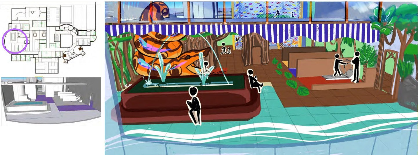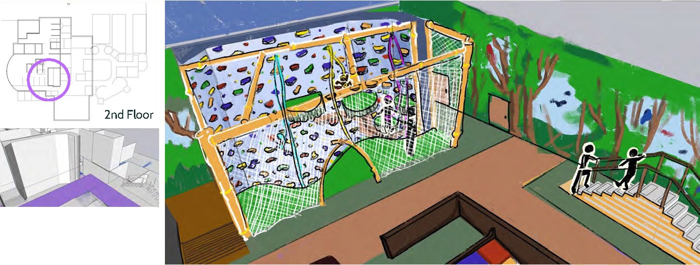 On the west side of Appointment Play is the physical therapy rainforest. The rainforest is home to a two-story window, helping to blend the interior jungle space with the surrounding real-world flora and fauna.