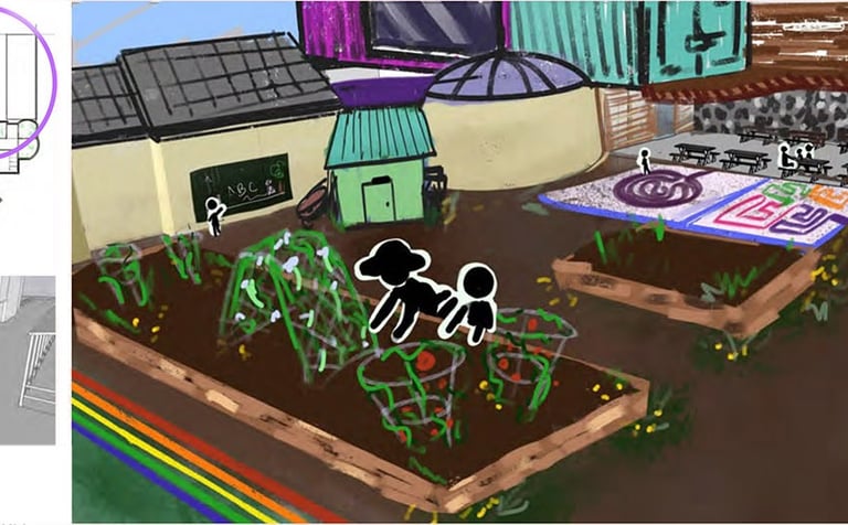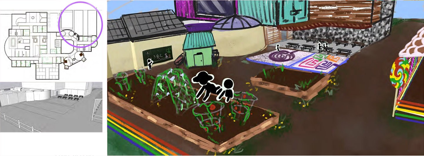 Just outside are ample park benches, seating areas, a gardening corner, and meditation mazes encouraging everyone to take some time to get fresh air.