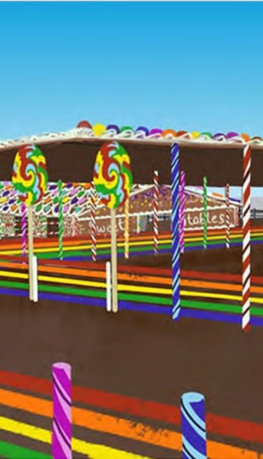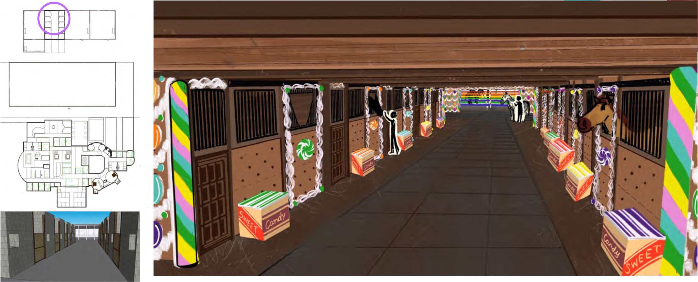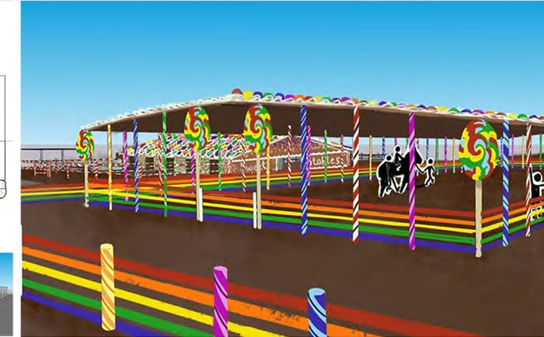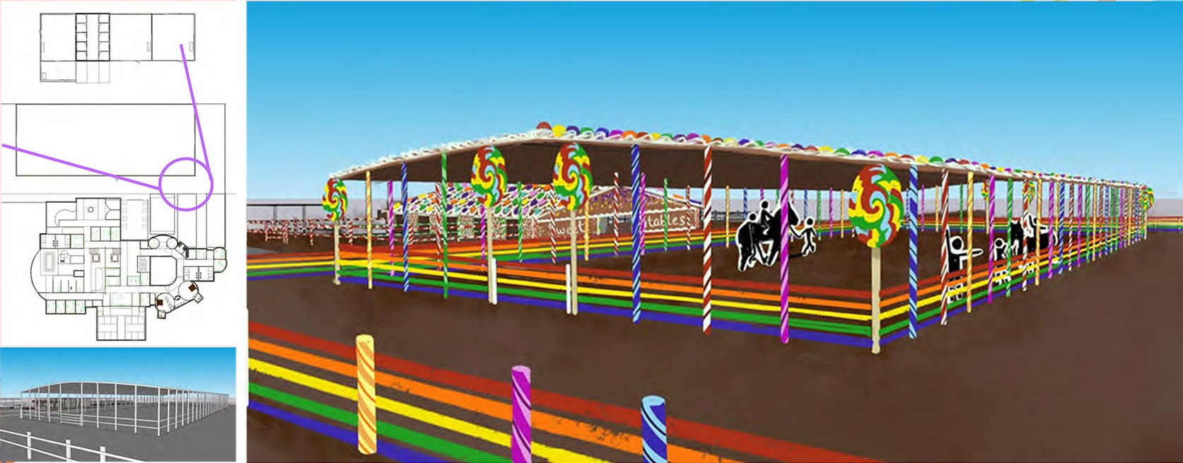 Outside of Appointment Play’s main building is Sweet Stables, a sweet retheming for hippotherapy. Adventurers become equestrians as they travel through gingerbread and larger-than-life sweets.