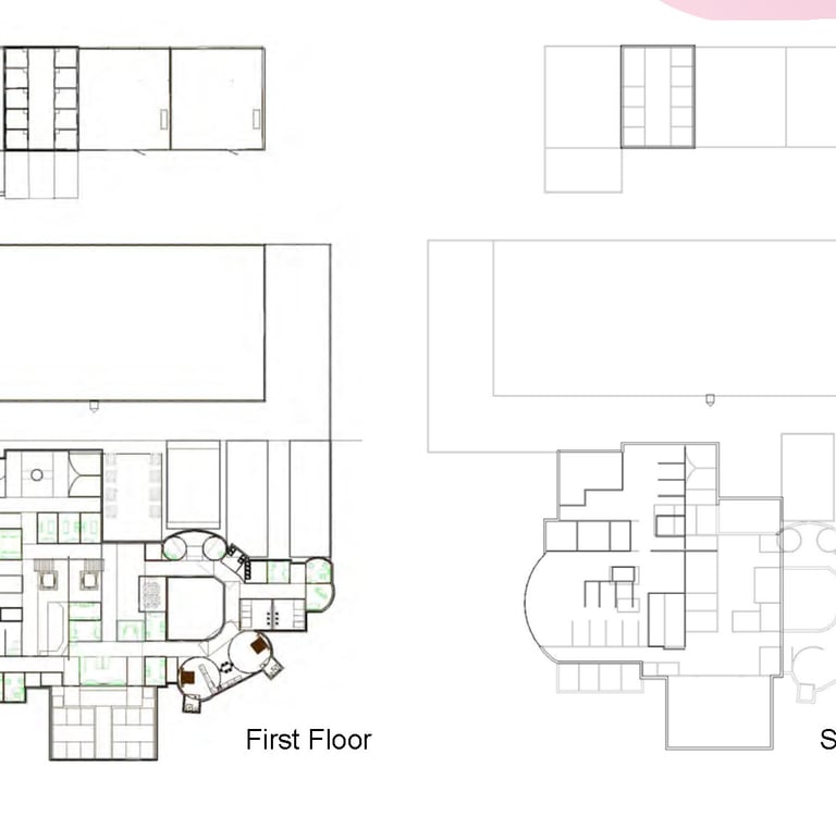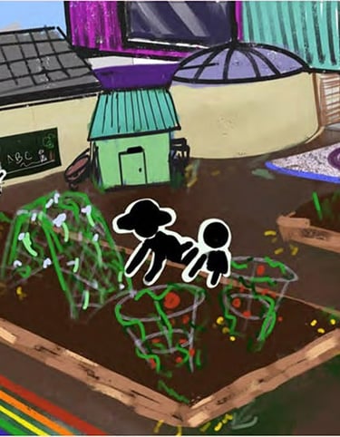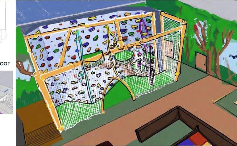 My design has an overall footprint of about 80,000 square feet (79,539.63). Approximately 11,000 square feet across two levels to create the physical therapy rainforest, 8,500 square feet to blast into outer space with Kepler - 186f, 11,000 square feet with two floors for staff, 14,000 square feet dedicated to horse stables with a 16,000 square foot riding arena, 1,000 square foot area dedicated to meditation maze(s), 3,200 square feet space for gardening, and a 1,400 back deck seating area for all to enjoy.