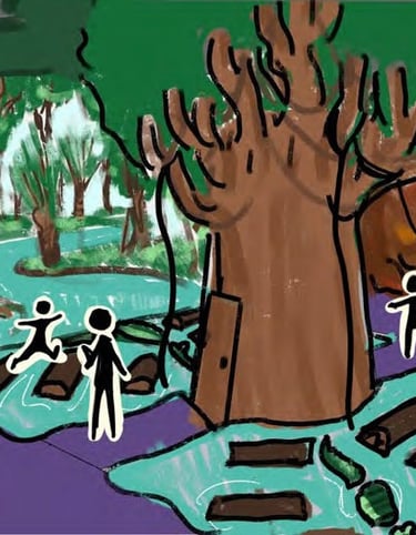 Gather at the watering hole for a new balance challenge. Foam logs and lead a path to a center ‘safe’ tree, providing vines as supports from falling into the watery crocodile-filled depths.