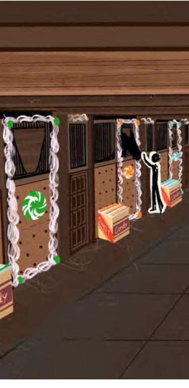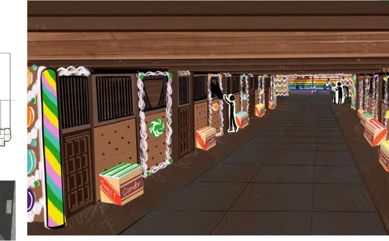 Just beyond the arena are Sweet Stables, a gingerbread and candy decorated stable space.