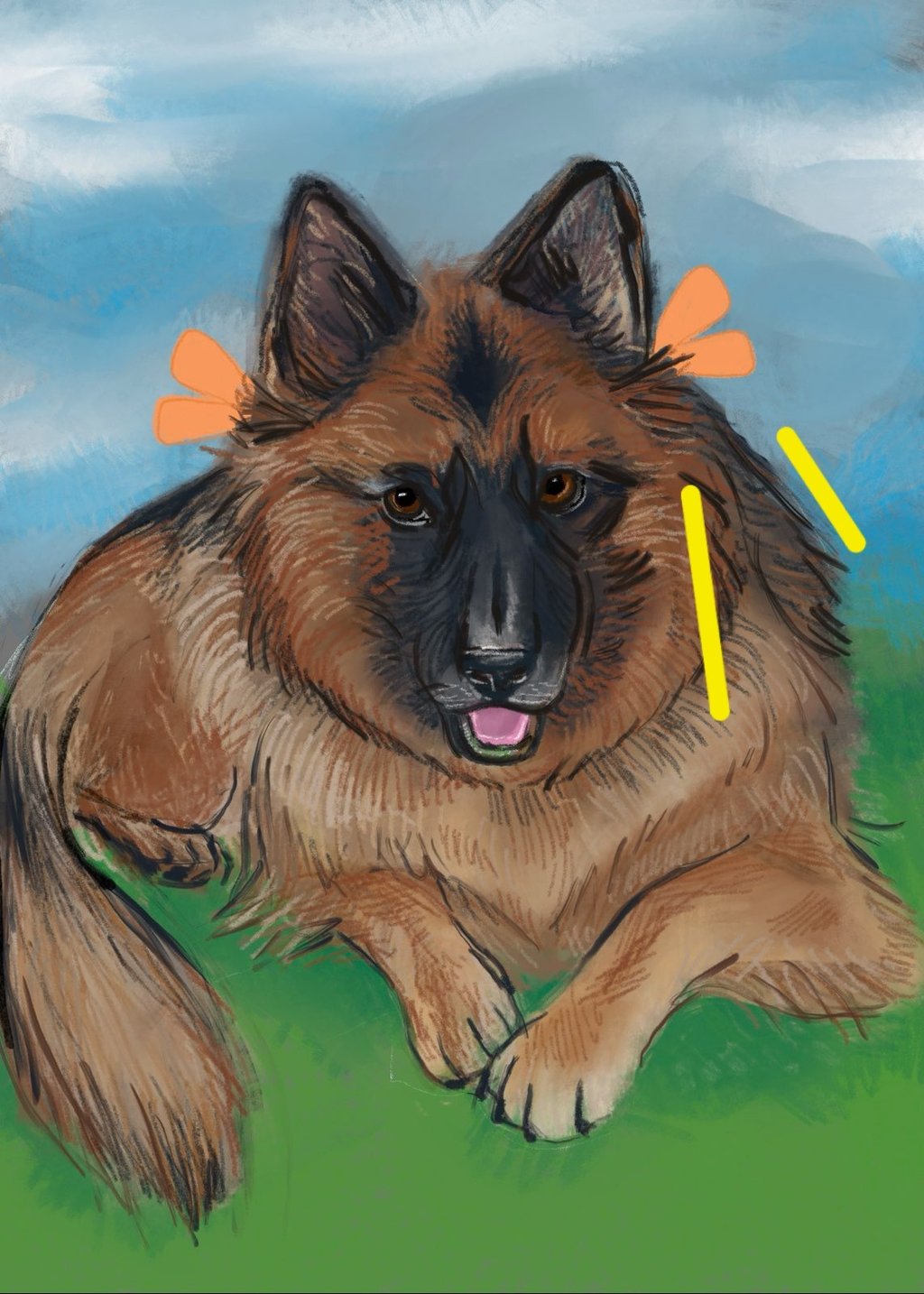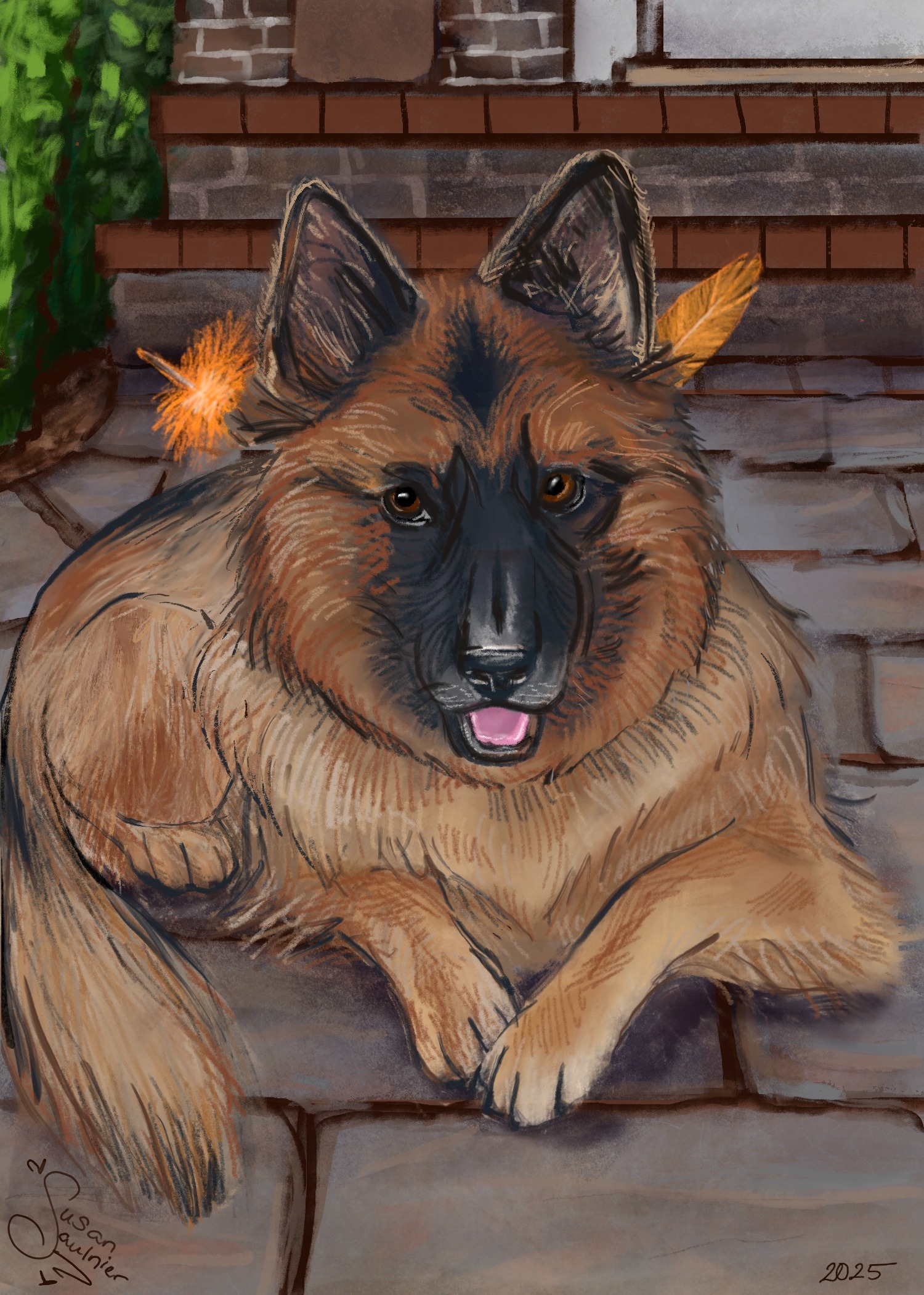 Above is the progression of my work. I started by photo-bashing pictures of Ana to get a general shape and feeling before going in with color. I treat my digital paintings like my traditional paintings, often working on one layer and maybe putting elements (ie, the feathers) or particularly challenging parts (the mouth and her ears tripped me up) on a separate layer to focus on. I used a placeholder field background until I received the direction for the front porch. I was also told that she looked a little too large on her right side (indicated by the yellow lines). I trimmed down the fur and placed her smiling at home. I used ProCreate for the project.