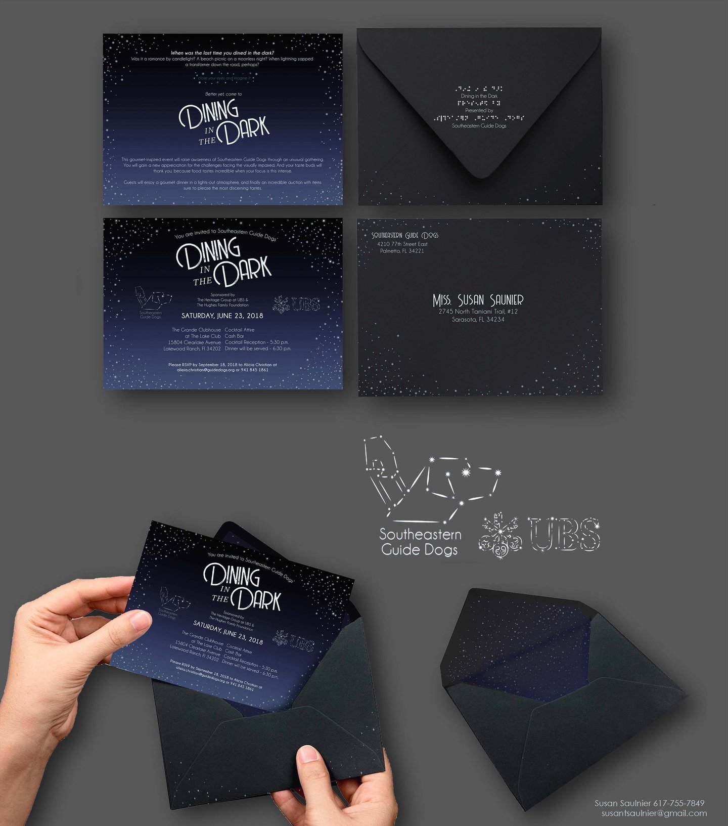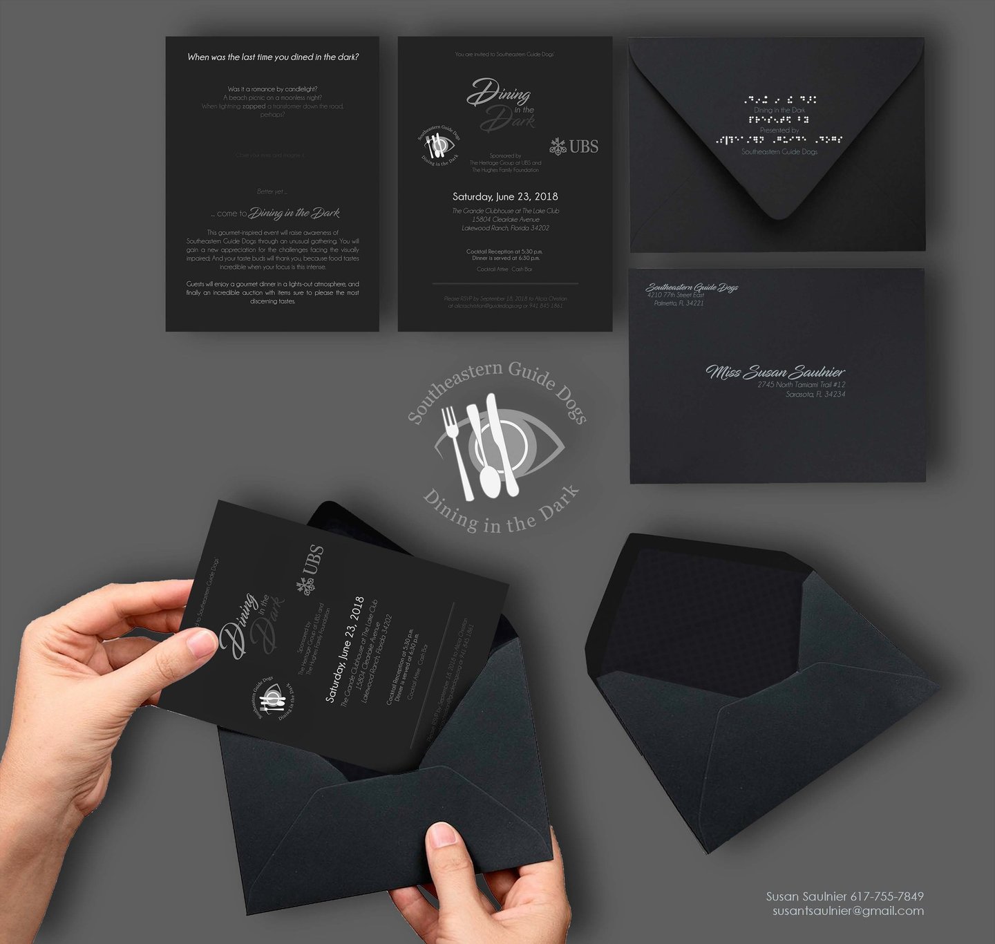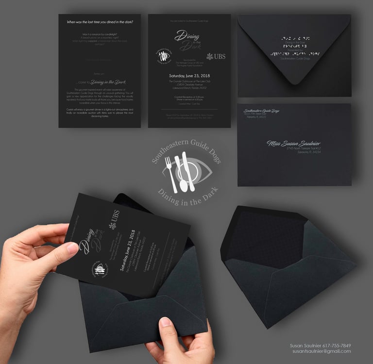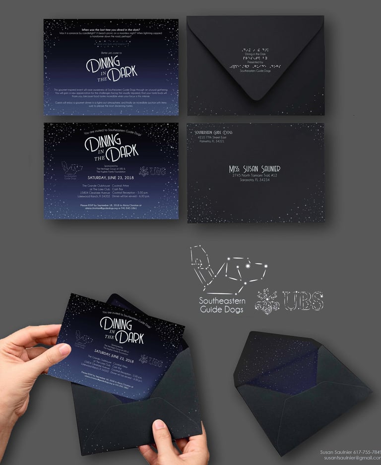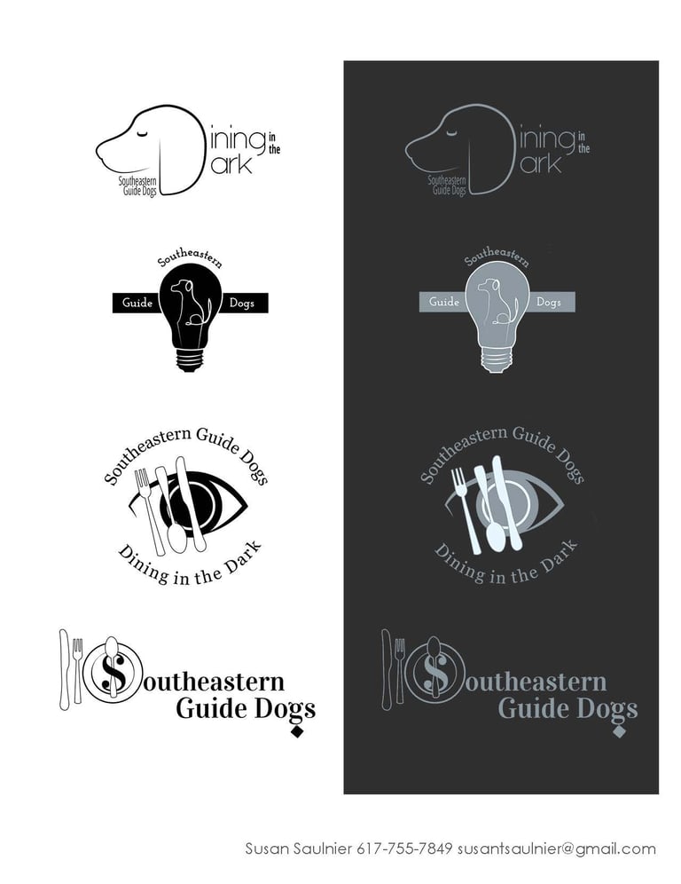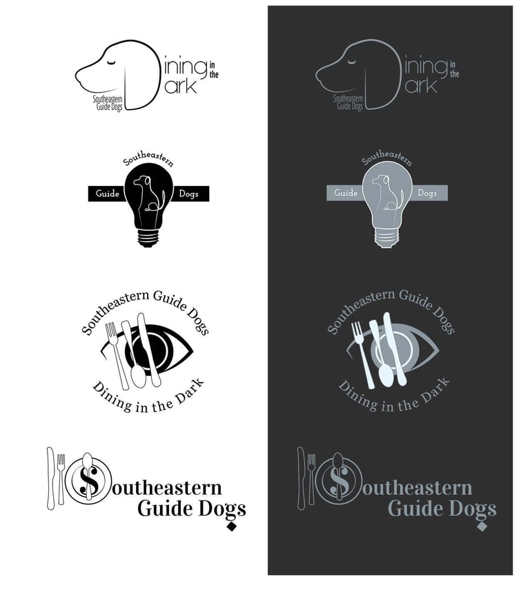 As part of an art test for the Southeastern Guide Dogs, I was challenged to blue sky pitch logos and invitations to their fundraising dinner, 'Dining in the Dark.'