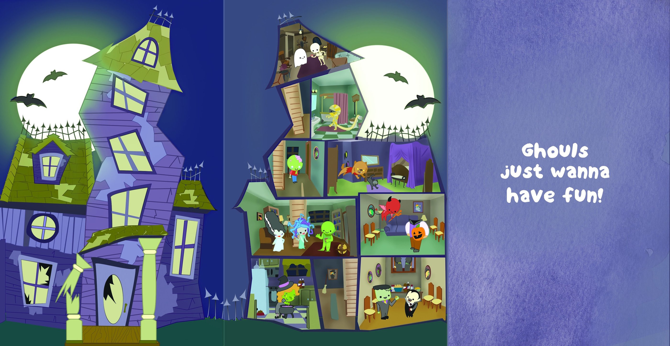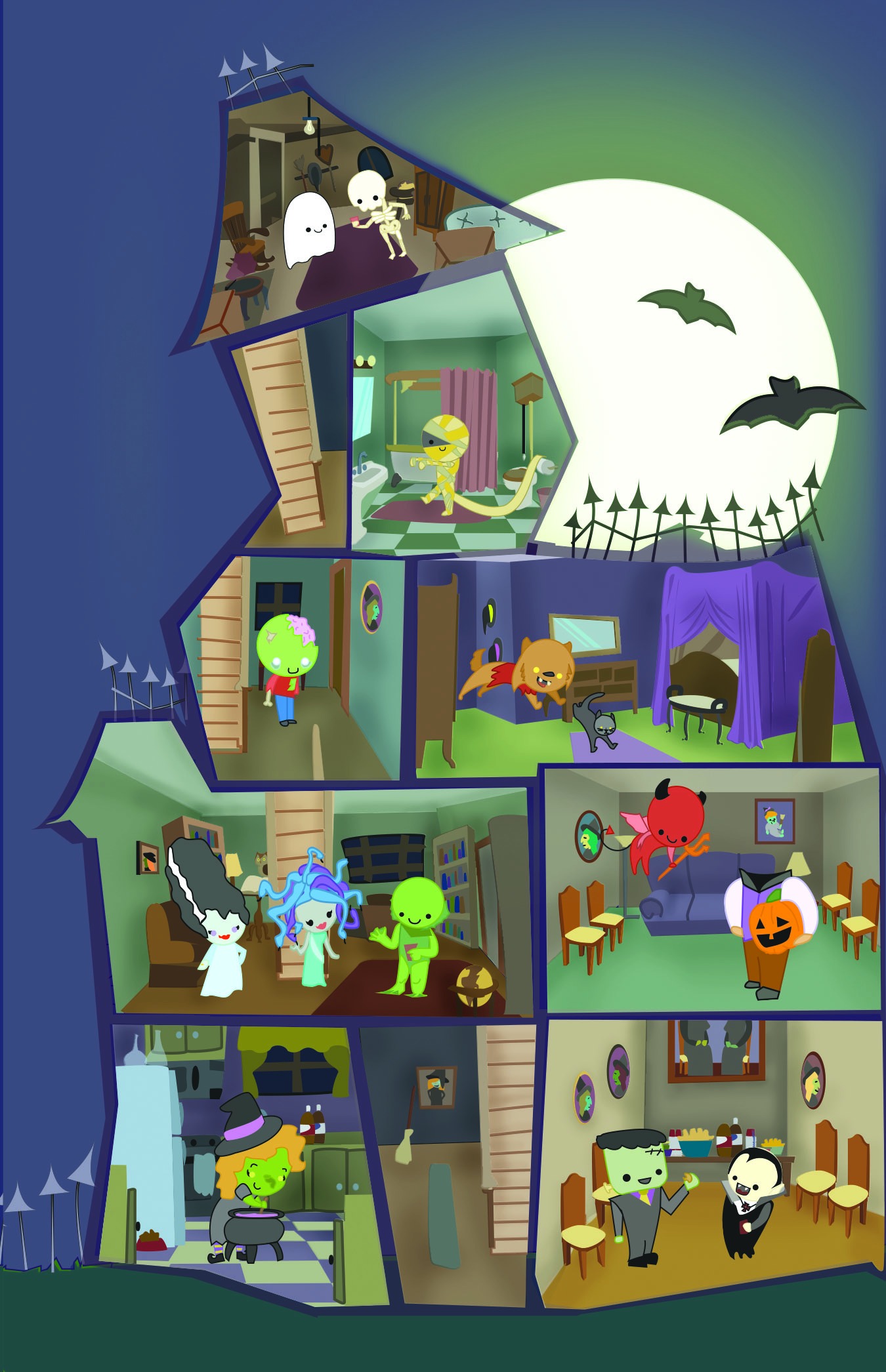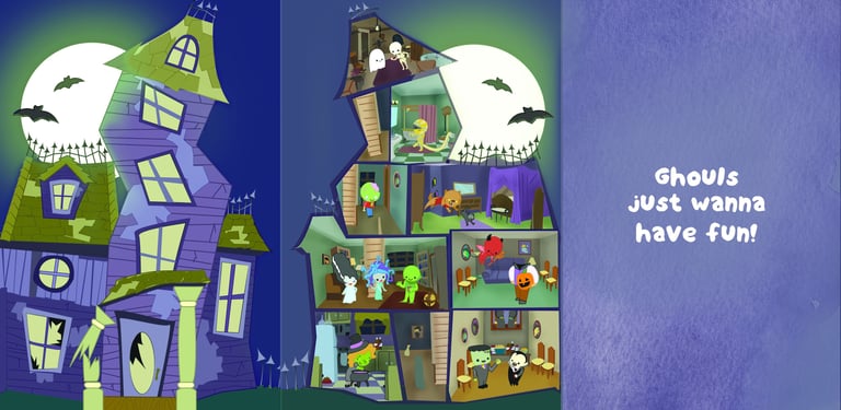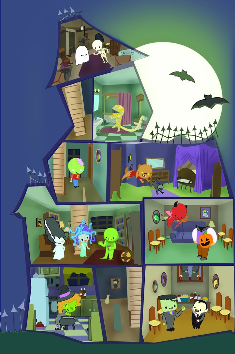 Above left are all of the characters attending the witch's party. Above center and right are my sketchbook showing the ideas for the house, the rooms, and the guests attending the witch's party.