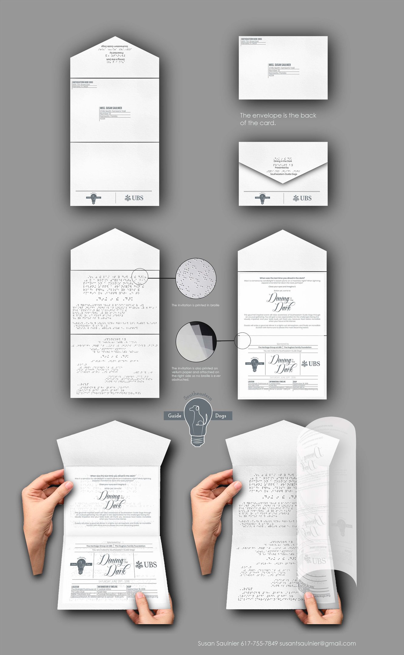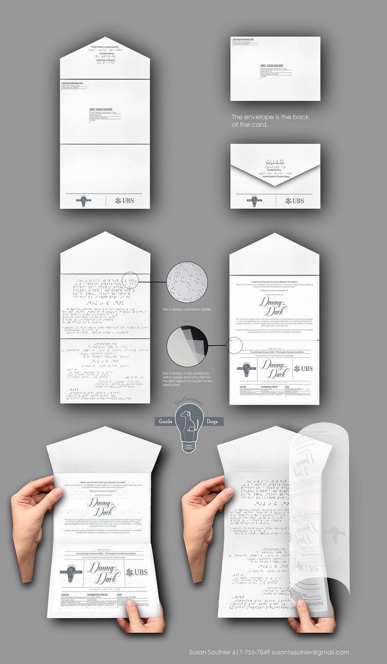 I wanted to highlight and utilize brail in my invitation designs, all the way down to the envelope. Programs that were used for this project were Adobe Photoshop, Illustrator, and InDesign.
