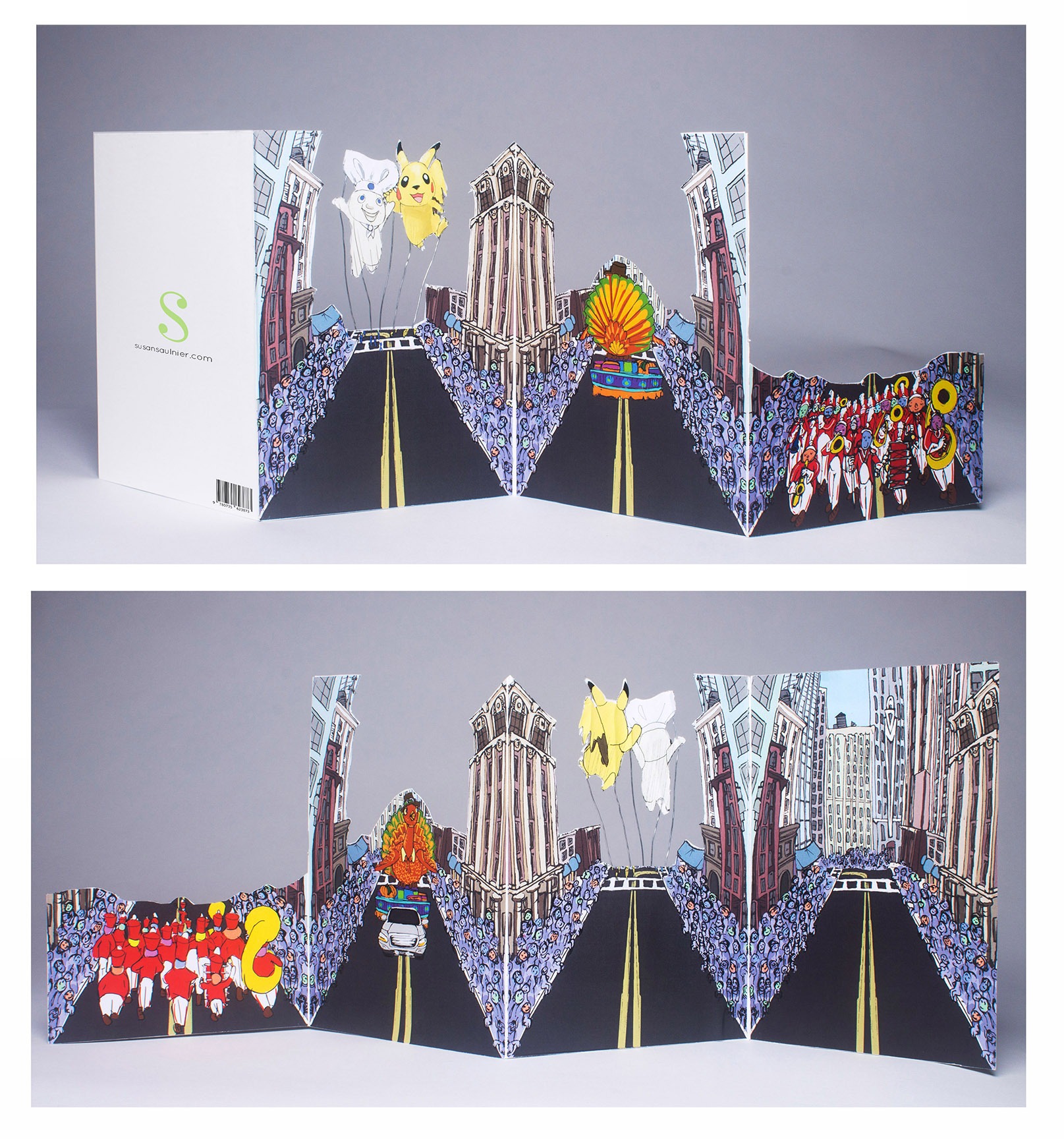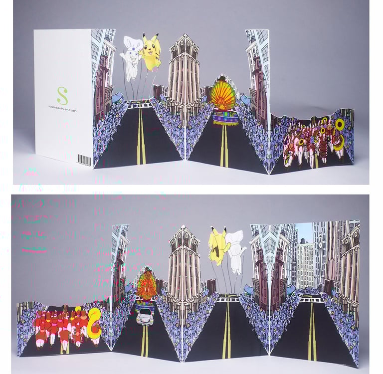 This is my Thanksgiving Card prototype. My favorite part of Thanksgiving has always been the magic surrounding the parade, with giant balloons, complex floats, large bands playing familiar songs, and so many people packed along the street, wanting to be at that epicenter of celebration. I have yet to go, which is probably why I wanted to make this condensed, collapsible version. Everything was first drawn in my sketchbook and then scanned in and colorized in AdobePhotoshop.