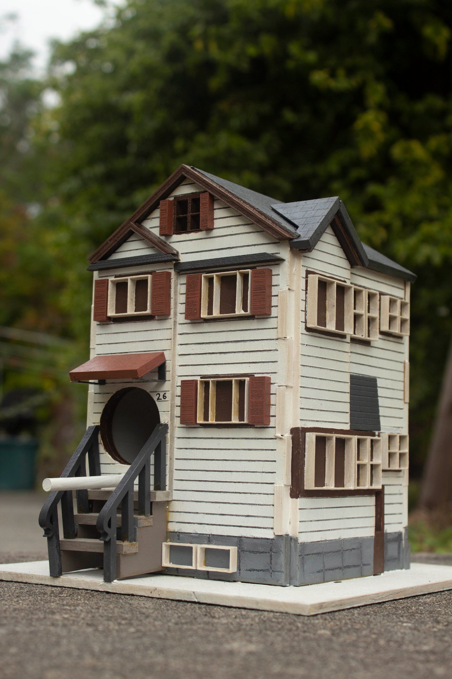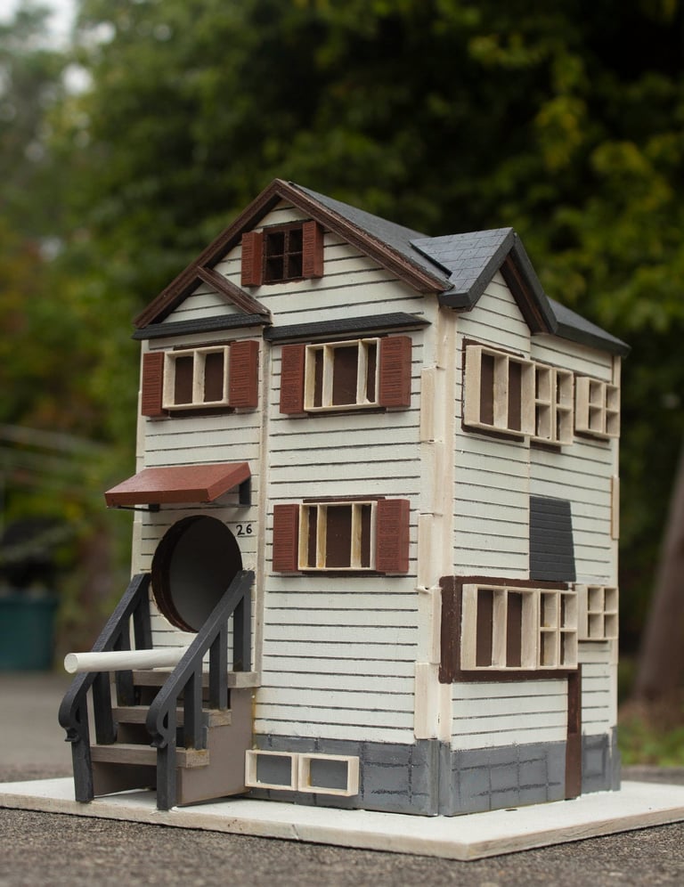 Left is the birdhouse of my childhood home and my first laser cutting project. The design was mapped and outlined in Adobe Illustrator, and an SVG file was uploaded to the GlowForge app, to the laser cutter. Once cut, I painted and glued everything together.