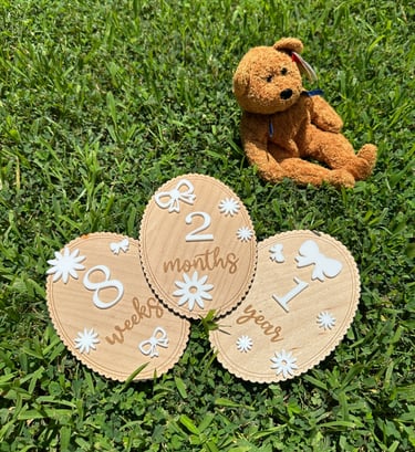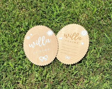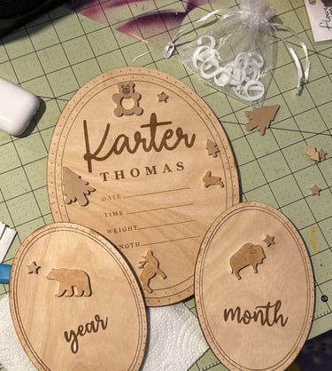 As my friends and family have started to grow their families, I have had the honor of creating arrival announcements and time plaques. I do not attach any of the acrylic elements or numbers, but will attach names upon request. I ask for any nursery or baby shower theme for the acrylic pieces so that it matches other purchased and existing decorations. Evertyhing is designed in AdobeIllustrator and cut on my GlowForge Laser Cutter.
