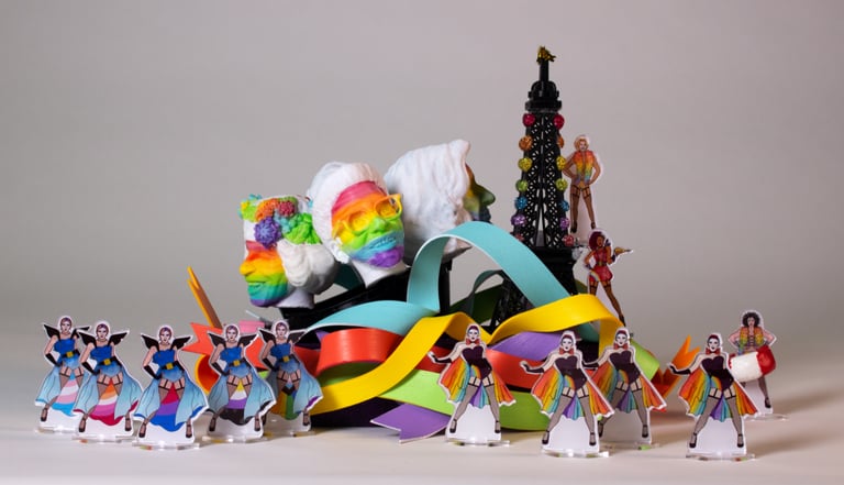 Above: My team's float, highlighting Bayard Rustin, Harvey Milk, Marsha P. Johnson, and Sylvia Rivera. All are depicted in the marble statues like the film, and their faces painted in full rainbows, representing them braking the mold and being their true selves.