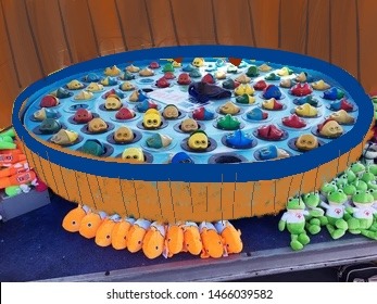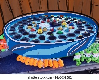 Claw-grabber prize game; The top-left is themed to and represents ocean quality in 1920s and the top-right is a modern hook game and represents ocean quality of 2020s.